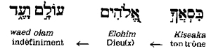 La bible traduite par les membres du rabbinat français sous la conduite de M Zadoc Khan rend ce texte ainsi: « Ton trône (fondé par) Dieu, durera a jamais ». Cette même extrapolation se rencontre chez les traductions allemandes et la traduction des Témoins de Jehovah[1].